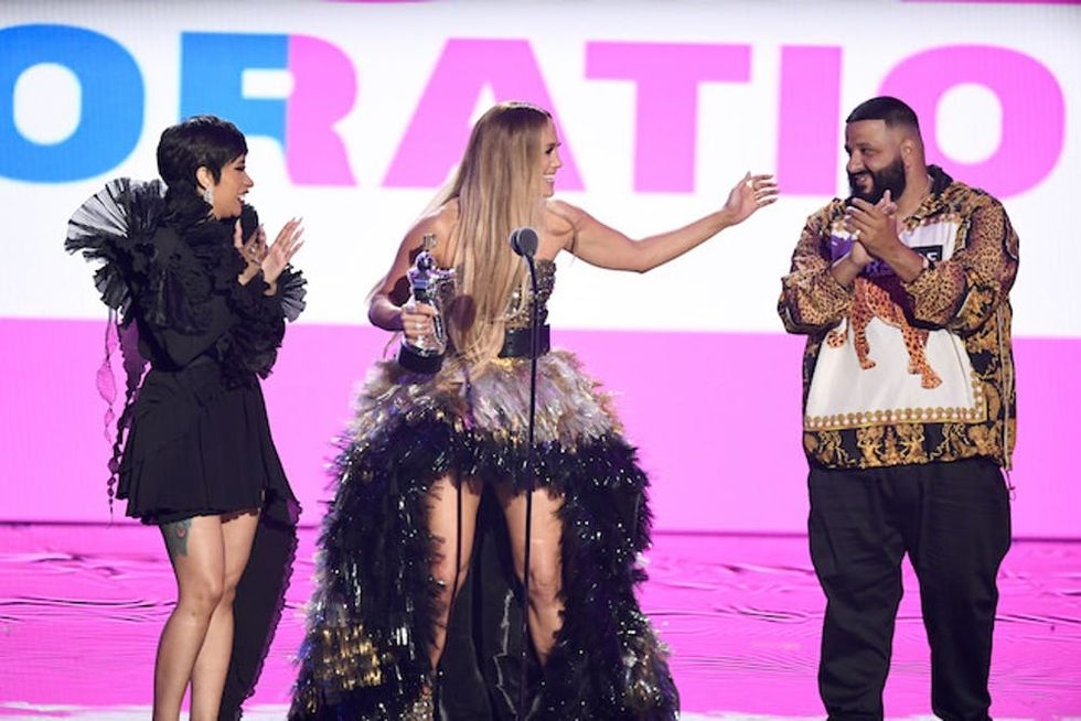 1. Jennifer Lopez: It was perhaps the biggest night for J.Lo as she made Video Vanguard history by being the first Latin artist to win the prestigious award. She donned four gilded and glittery looks throughout the evening in celebration, but it’s this belted, beaded, strapless dress with a peacock skirt that turned heads… and ruffled feathers. (Kevin Mazur/WireImage)