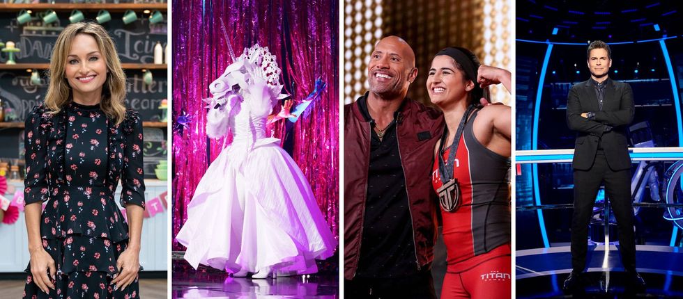 If you've been combing the winter 2019 TV schedule for your next favorite show, you might have noticed that a lot of the new series are competition shows. In addition to legacy singing competitions like The Voice and American Idol, as well as reality TV pioneers such as Big Brother and Survivor — going into their 21st and 38th (!) seasons, respectively — there's a new crop of competitive series that promise celebrities singing in disguise and everyday people striving for greatness alongside The Rock. Here's our guide to the (sometimes wild) new reality competition shows premiering this winter. (Photos via Food Network + Michael Becker/Fox + Vivian Zink/NBC + Brian Bowen Smith/Fox)