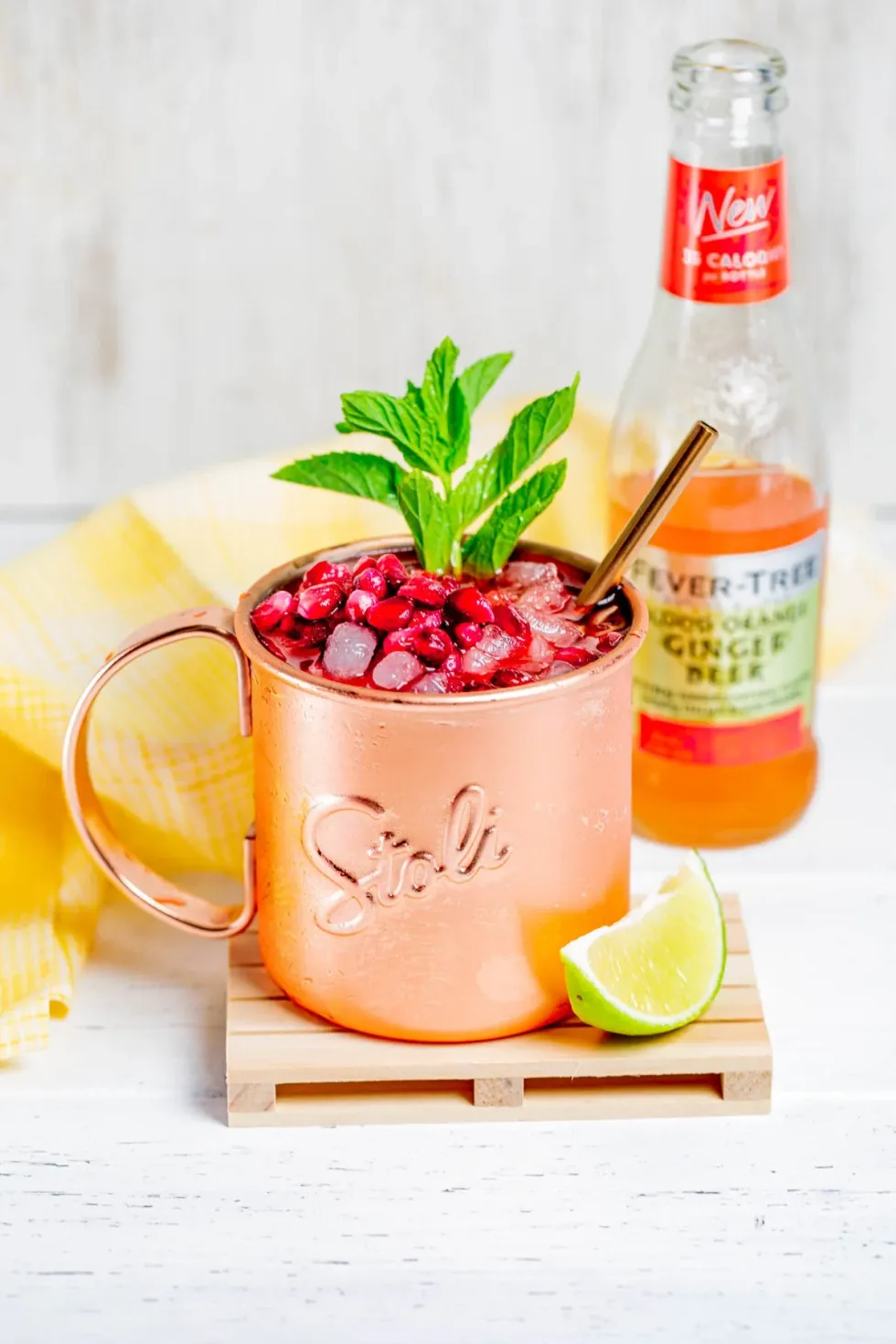 Add a colorful twist to the classic Moscow Mule with a vibrant Pomegranate version, blending vodka, lime, and ginger beer, creating a visually stunning and irresistible winter cocktail choice. (via Mixop)