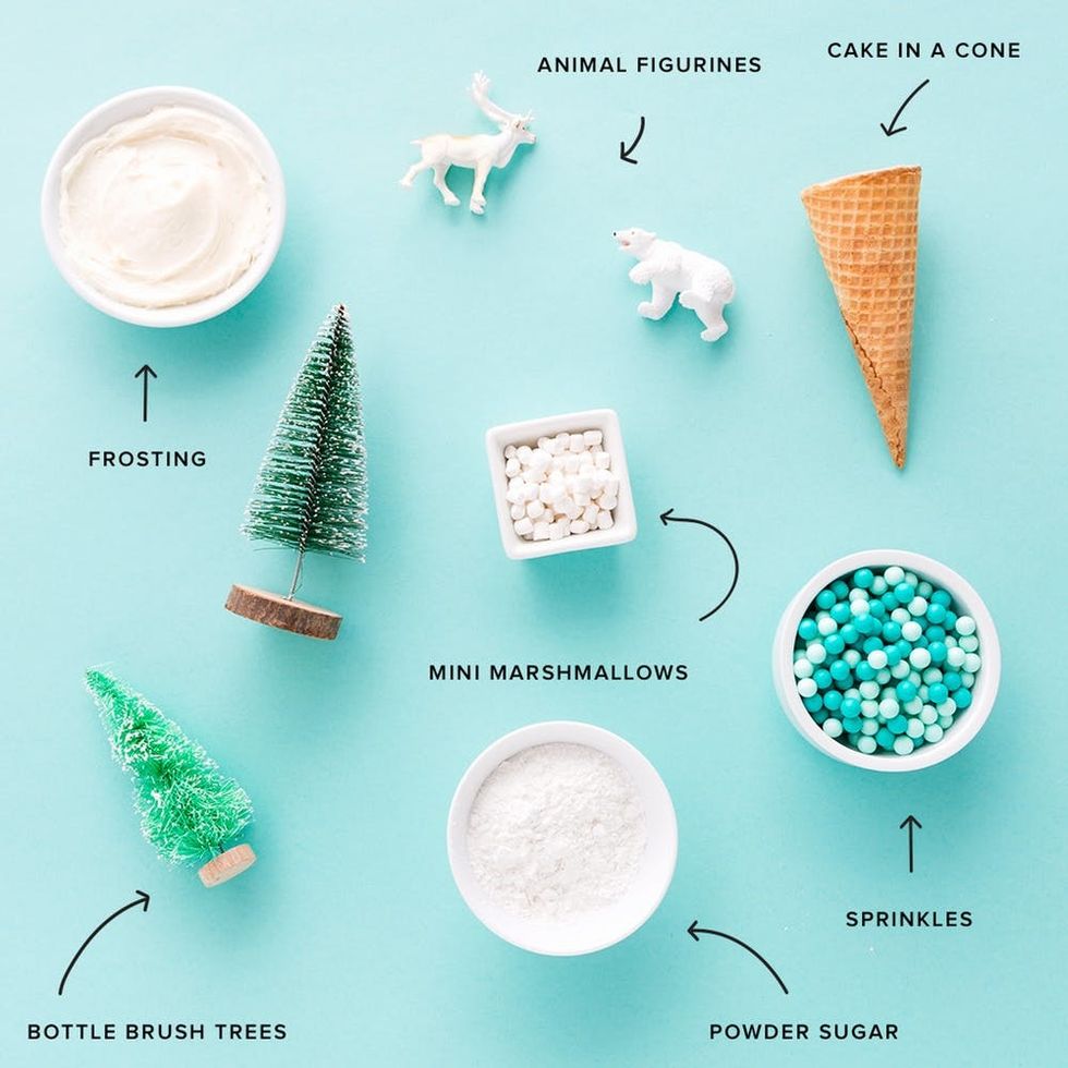 3. Add your winter scene on top using winter figurines, trees, sprinkles, powdered sugar “snow,” and other small toppings.