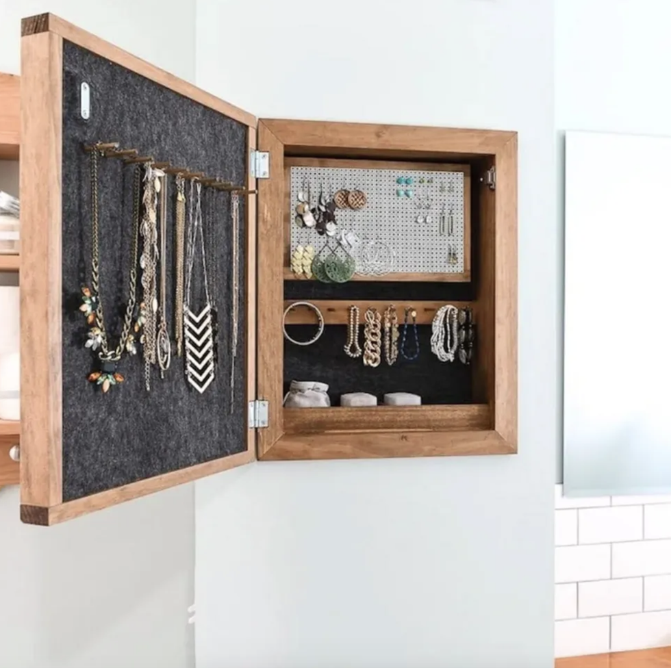 DIY Jewelry Organizer: Line-up all your favorite necklaces, earrings, etc. in this stylish accessory organizer. With hooks for every type of item — and a cute phrase on the front door — it's everything you need to keep your trinkets off the counter. (via House Full of Handmade)