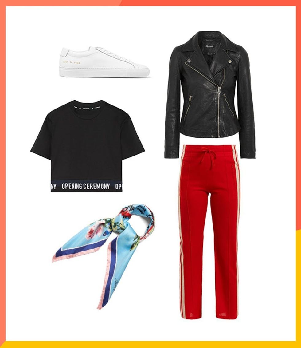 Clockwise from top left: Common Projects Original Achilles Leather Sneakers ($410), Madewell Washed-Leather Biker Jacket ($500), Isabel Marant Étoile Dobbs Track Pant ($375), Dolce & Gabbana Rose-Print Silk Scarf ($325), Opening Ceremony Cropped T-Shirt ($85)