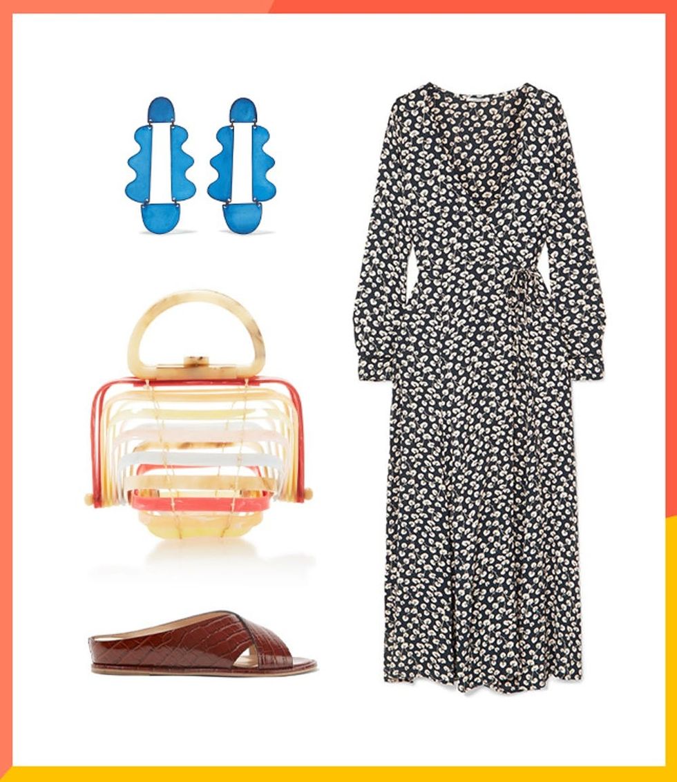 Clockwise from top left: Annie Costello Brown Matisse Earrings ($205), Ganni Roseburg Printed Wrap Dress ($250), Gabriela Hearst Ellington Croc-Effect Sandals ($595), Cult Gaia Small Lilleth Tote ($348)