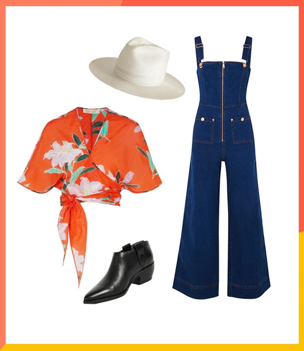 Clockwise from top left: Janessa Leoné Alexander ($295), Alice McCall Quincy Denim Overalls ($310), Sigerson Morrison Dorie Ankle Boots ($395), Diane von Furstenberg Printed Cotton Wrap Top ($190)