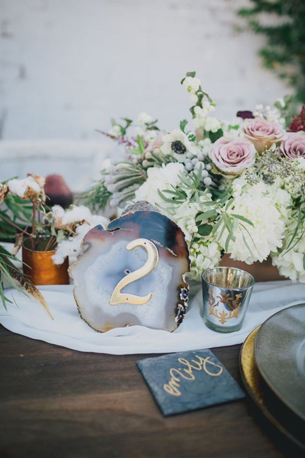 4. Geode Table Numbers: Milky whites and warm natural hues mixed with a brass number make for an unexpected and functional table centerpiece your guests will want to take home. (via Kristen Dee Photography / Utterly Engaged)