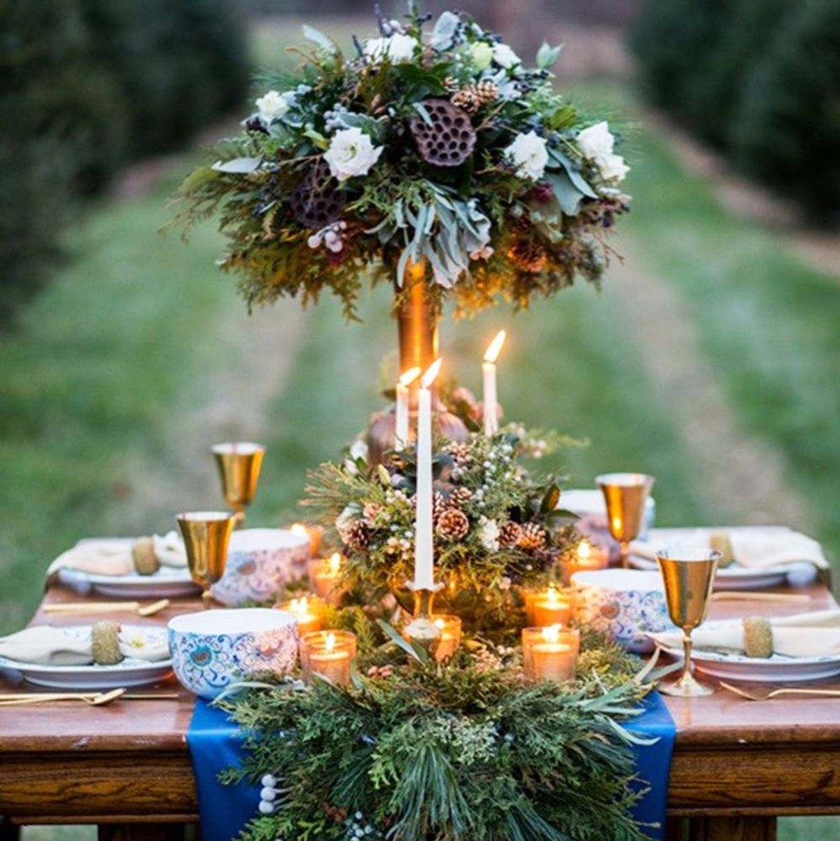 3. Blue, Green + Gold: Simple meets chic with this classy tablescape showcasing a brilliant blue runner, evergreen garland and pinecone-filled centerpieces. (Photo via Alyssa Wood of Isa Images)