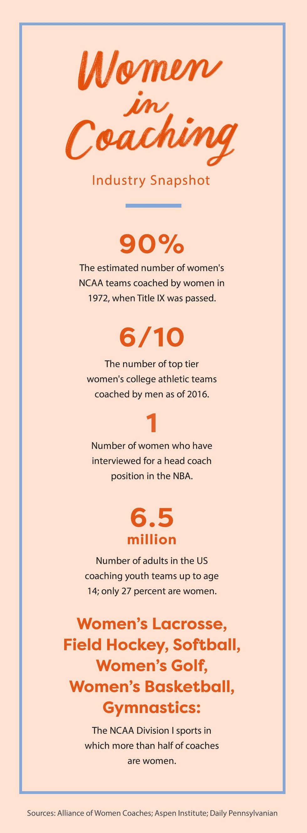 Before Title IX, women coached 90 percent of women’s college teams. Today, slightly more than 40 percent of college-level coaches are women, and that lack of diversity funnels into professional sports as well.