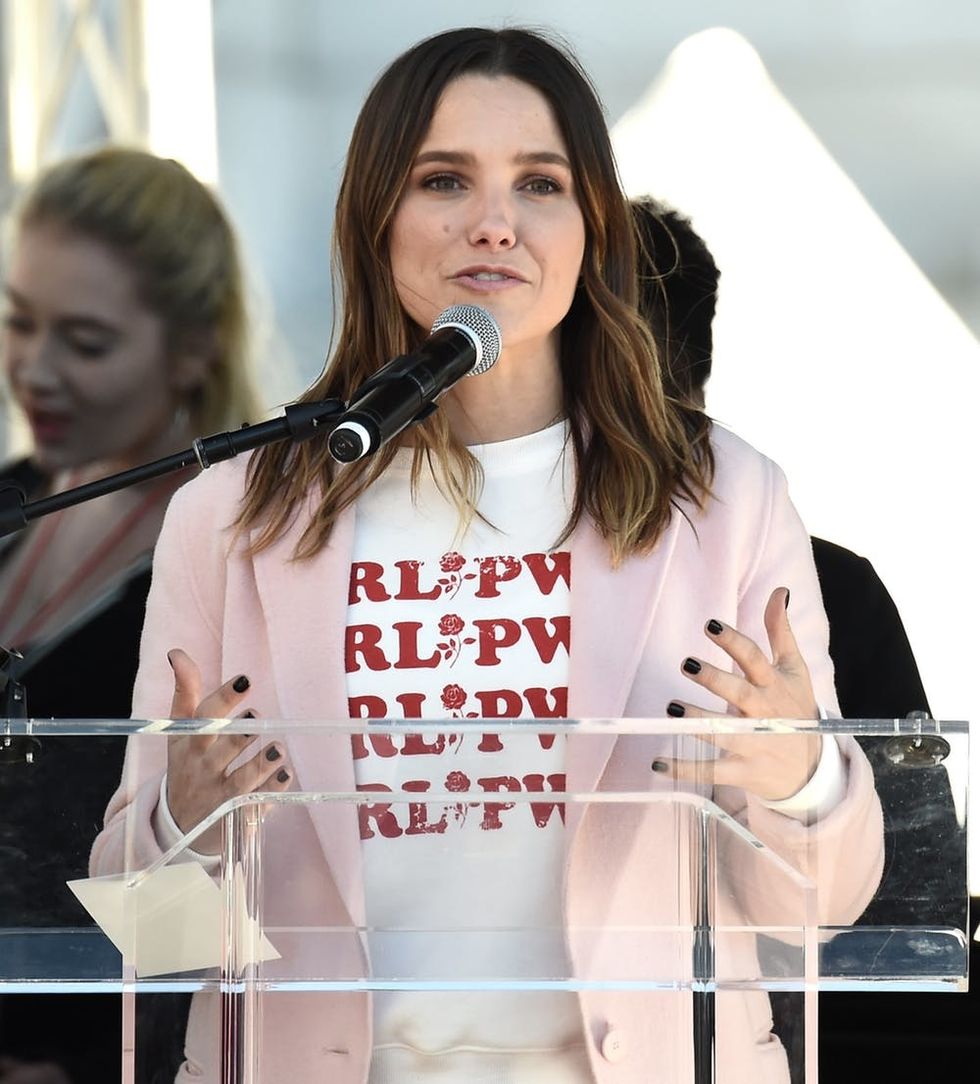 A statement-making “GRL PWR” Rebecca Minkoff sweater ($88) was spotted all OVER the events, from the stage at the Women’s LA March, where Sophia Bush was speaking, to the depths of the crowd, where everyone from Krysten Ritter and Mandy Moore to Victoria Justice, Jamie Chung, and Catt Sadler proudly bore the #BossBabe “crewnecks.
