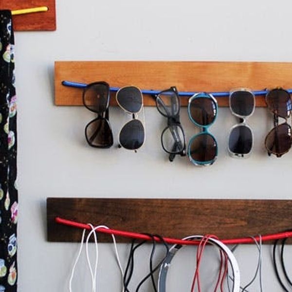 Scarves, sunglasses, cords, jewelry… if you’re in need of some major accessory organization, you’re going to love our next DIY hack: the Wooden Bungee Wall Organizer.