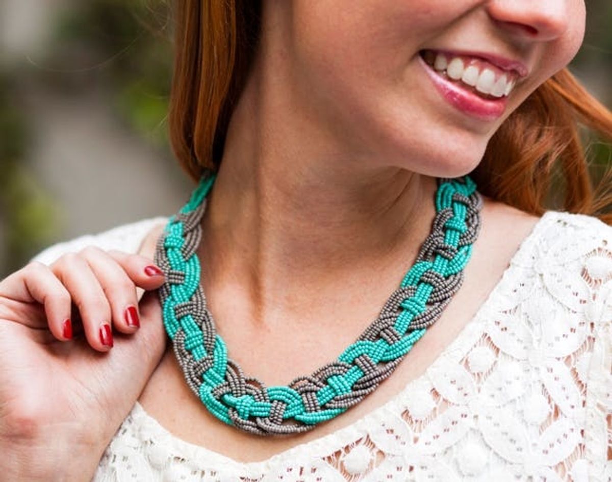 Listen up chicas! Looking for a spring statement necklace now that the weather has turned for the better? We’ve got some advice: stop shopping, and start making! ‘Cause see this necklace right here? It can be made for under $15. We know… unreal, right? All it takes is the patience to follow a semi-intricate weaving pattern, and you’ll be ready to rock it in no time!