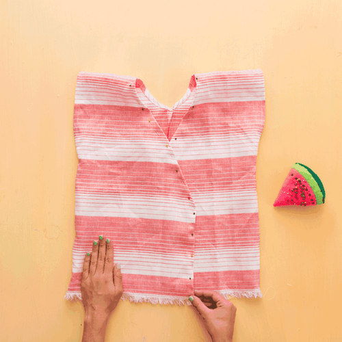Measure the length of your underarms and measure on either sides of your fabric. Pin and then sew the sides closed to create arm holes in your new garment.