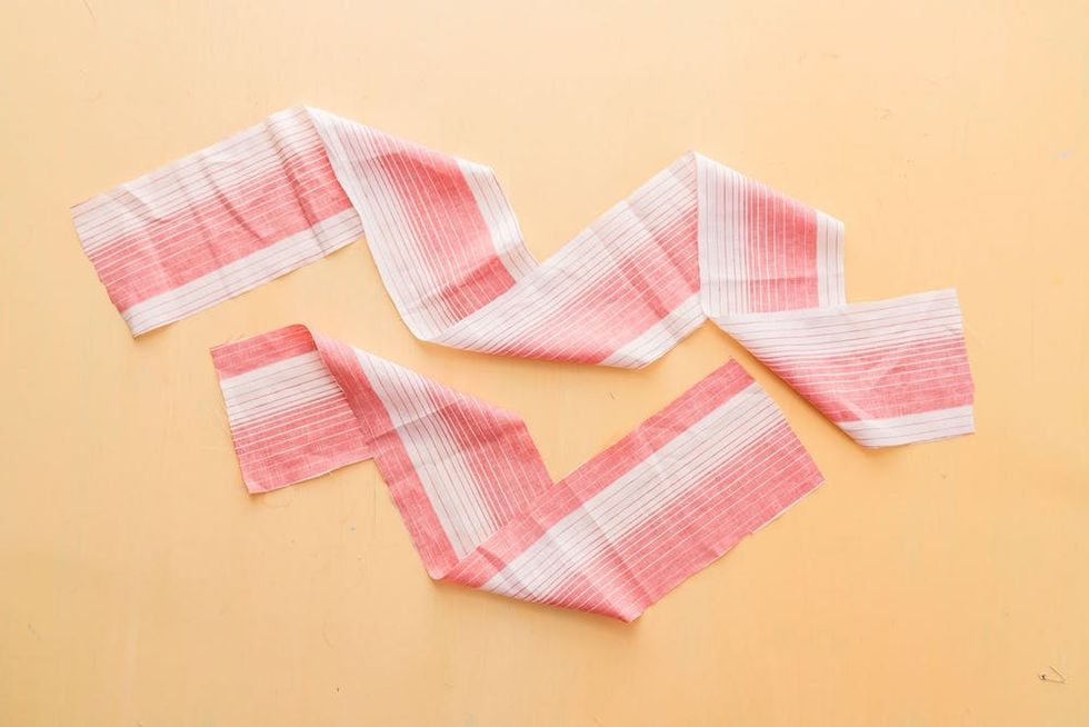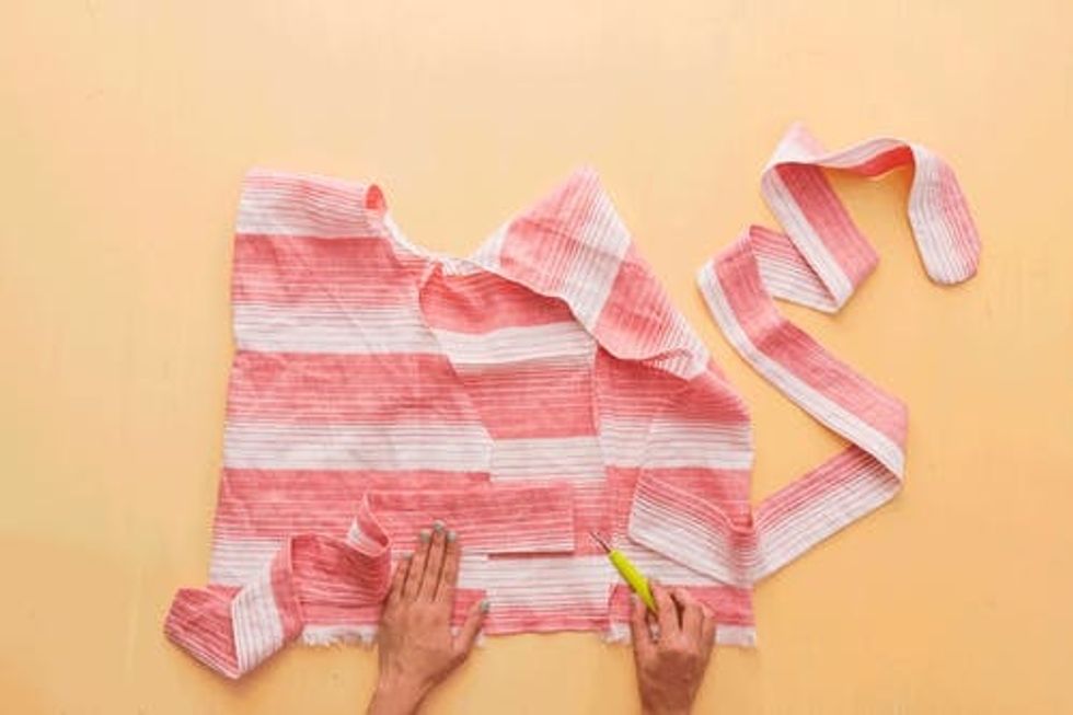 Next you’ll need to cut two strips of fabric to create your belt for the wrap shirt. One should measure 2x the circumference of your waist, and the other should measure half the circumference of your waist. Fold in half to sew, then turn right-side out to create a clean strap.
