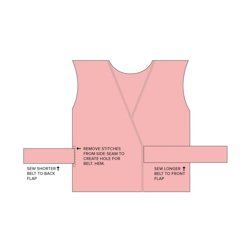 Use a seam ripper to remove the stitches on the right side seam right where the inner belt will hit. Fold the fabric back and hem to create a large hole.
