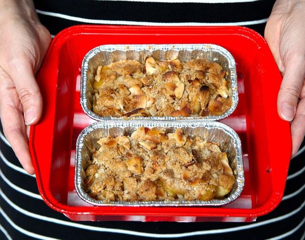 Divide your yummy cooked apples into two baking ramekins, then cover each with your crumble topping.