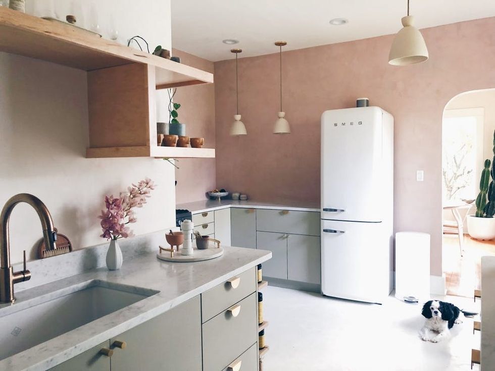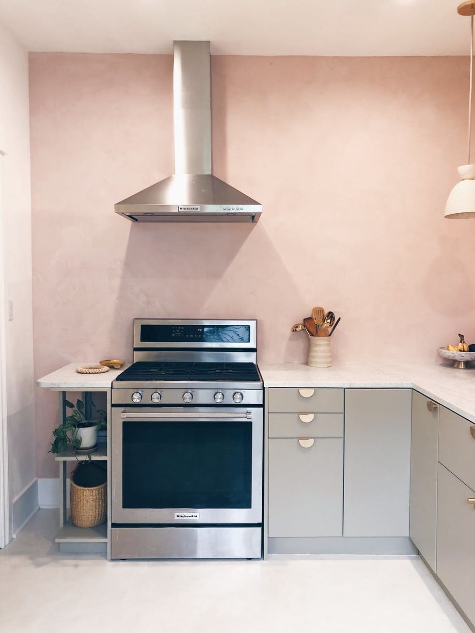 And while we haven’t seen this of-the-moment blush hue used in kitchens much before, we have to admit that it totally works in this space. Brass hardware makes the overall look feel grown-up and feminine. And Wu’s kitchen proves once and for all that metal-mixing is definitely allowed.