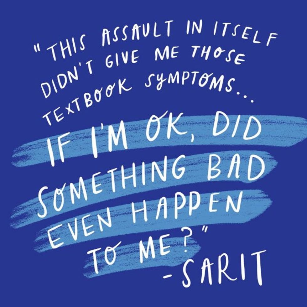 “This assault in itself didn’t give me those textbook symptoms like flashbacks or dissociation,” Sarit says, in part because she had experienced similar situations several times in the past, leading her to think it was normal, and not assault. She says the assault made her feel “weird,” but overall she felt “okay.” She adds that about a year later, when she realized that what happened was assault, she struggled to cope with what happened. In the short-term, Sarit says she didn’t question the validity of her own experience, but she sometimes finds herself wondering: “If I’m okay, did something bad even happen to me?”