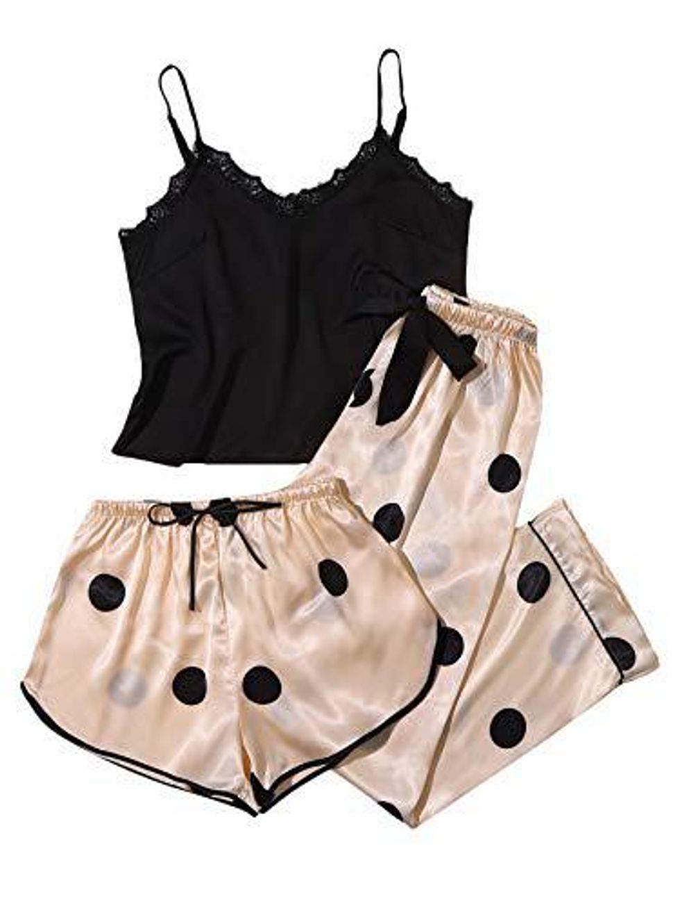 With a black lace trimmed cami, a cute polka dot print, and a satin-like short and pants to match, this three-piece set will make you look hot while you stay cool at night. Whether you're lounging at home or going on vacation, this set is a must for treating yourself.