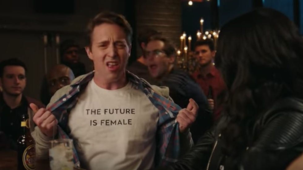 “Girl At a Bar” starts with SNL cast member Cecily Strong sidling up to the bar to wait for a friend who’s late to meet her. She’s immediately approached by a guy who is wearing the same “The Future Is Female” shirt as Strong, and after some friendly chatter about him not being one of *those* skeezy bar guys, he asks her out. When she declines, he calls her a b**ch. That escalated quickly!