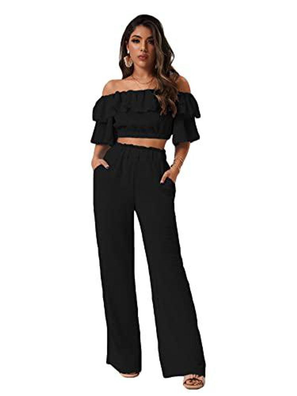 This two-piece set is a completely chic outfit all on its own. The high-waisted pants are flowy and comfortable, yet fitted enough to show off your lovely curves. The crop top is off the shoulder with ruffle detail and meets the pants at just the right place so you're comfortable but still showing off some skin.