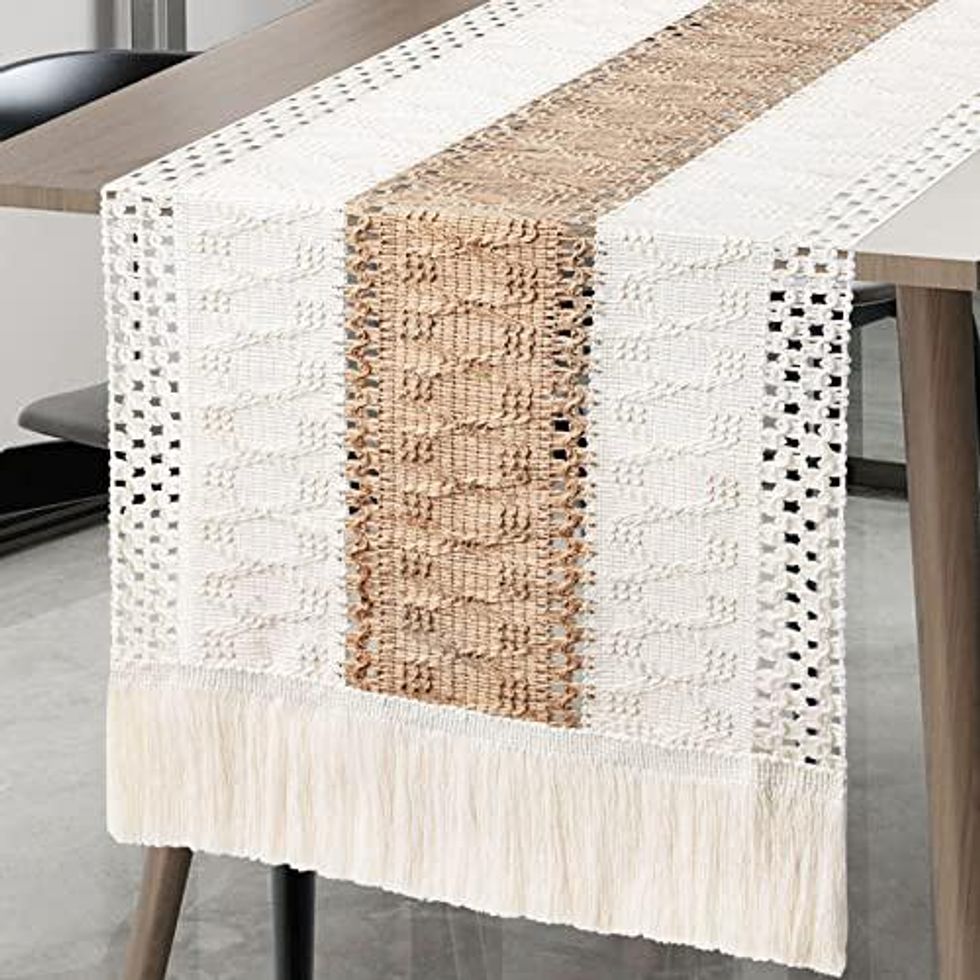 This table runner looks like it is right out of the Pottery Barn catalog with its neutral macrame details. Lay on a breakfast bar or down the middle of your dining room table to set the tone for a comfy cozy meal.