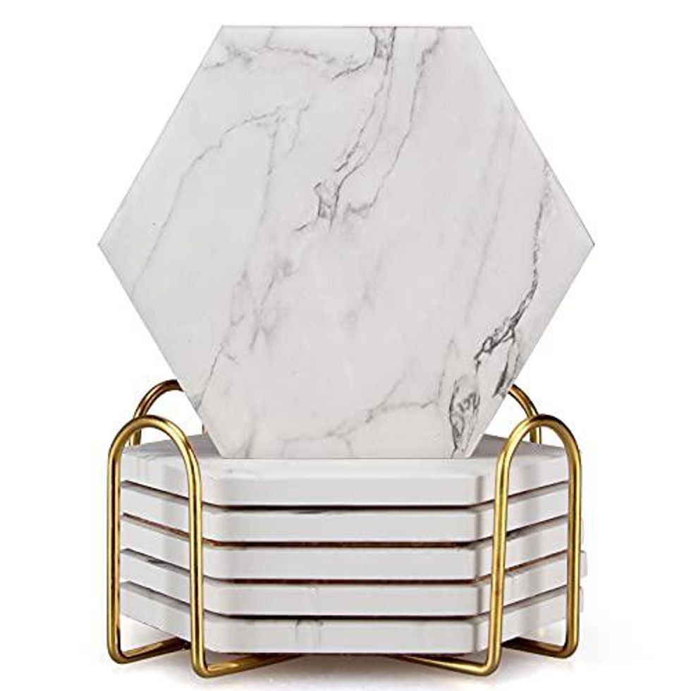 Keep these marble-looking coasters on your coffee table for when you and your guests chat over a beverage. This absorbent material ensures you won't have any watermarks on your furniture and there is even a cute little holder to reduce clutter when you aren't using them.