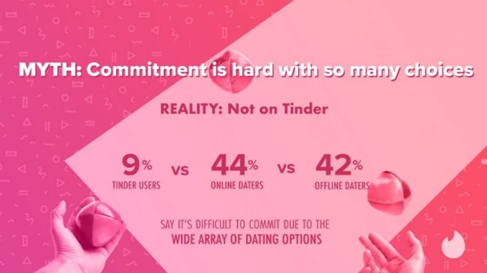 Anyone who has spent some time on Tinder knows that the number of people “in your area” who are looking to meet someone can be overwhelming — one could easily swipe left and right for hours. But Tinder found that the number of available people to date doesn’t stop people who use the app from committing to someone they like. Only nine percent of Tinder users surveyed said they had a hard time committing because of dating options, white 44 percent of online daters overall and 42 percent of offline daters said the same.