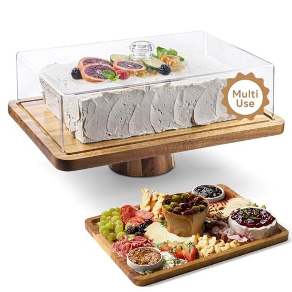 The two-in-one design of this stand is amazing. It allows you to use it as a cake stand or take the base off and make it into a charcuterie board. Keep ants at bay with the included acrylic cover.