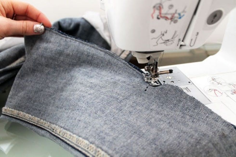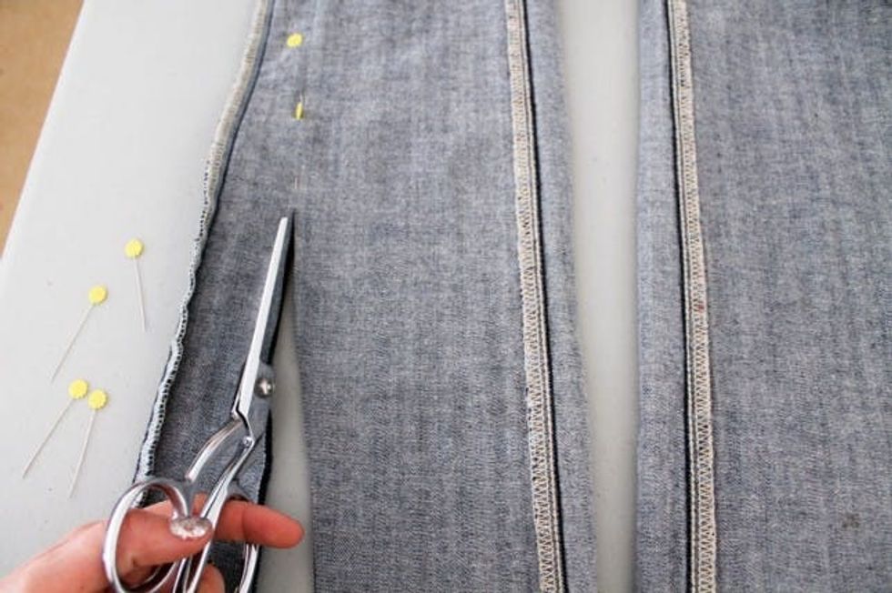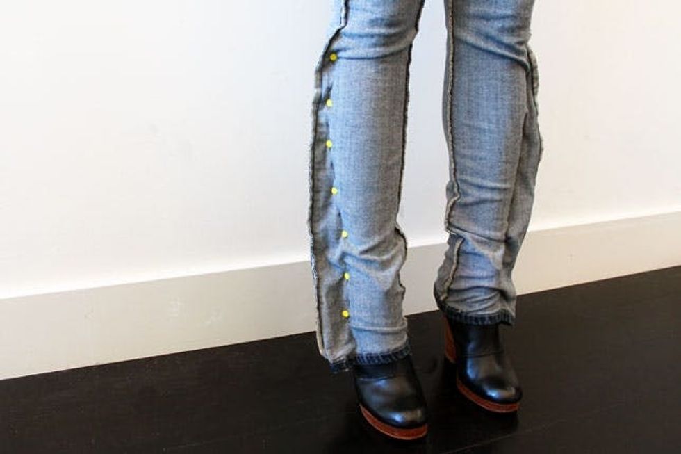 First, put on your jeans inside out (or put them on a friend who happens to be your same size) and pin along the outer seam to tighten the pants around your calves. It’s ok if the part you want to tighten is longer than your zipper.