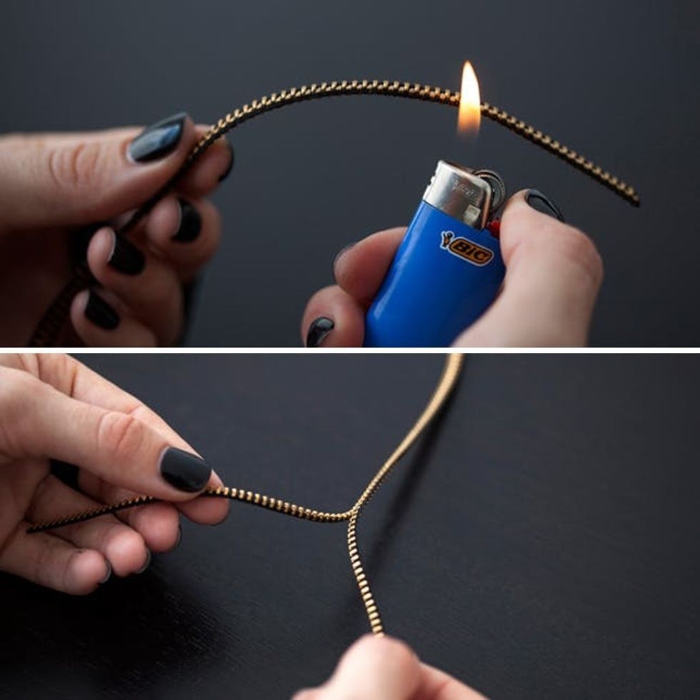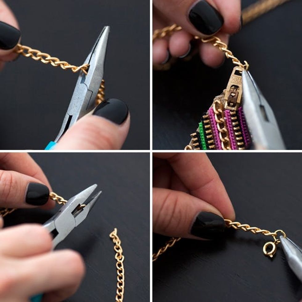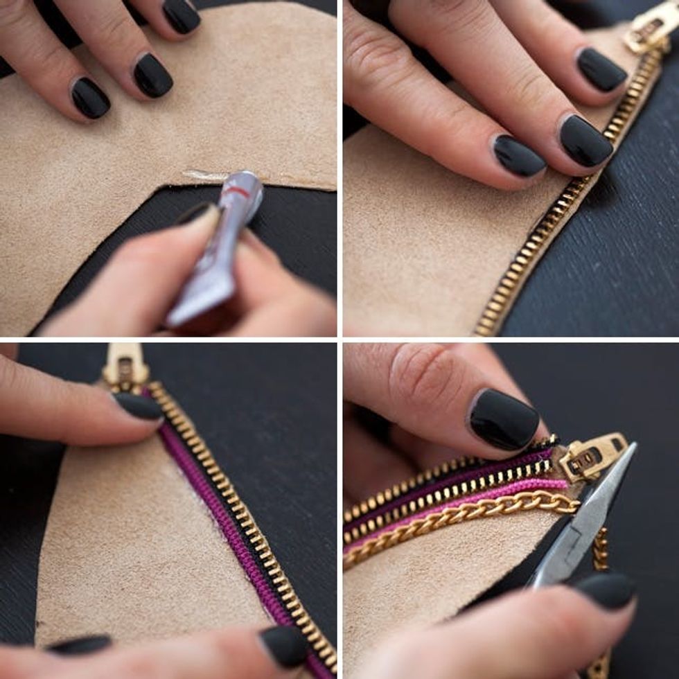 Use scissors or pliers to cut off zipper and chain ends at the end of the leather base.