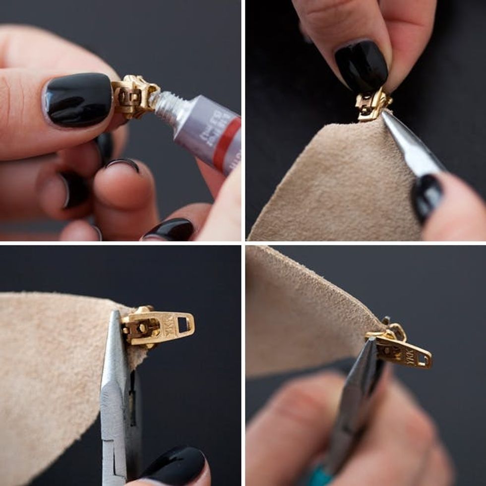 Woohoo! It’s time to use that zipper pull. Use glue to attach two zipper pulls to the end of the leather necklace base. Use pliers to secure.